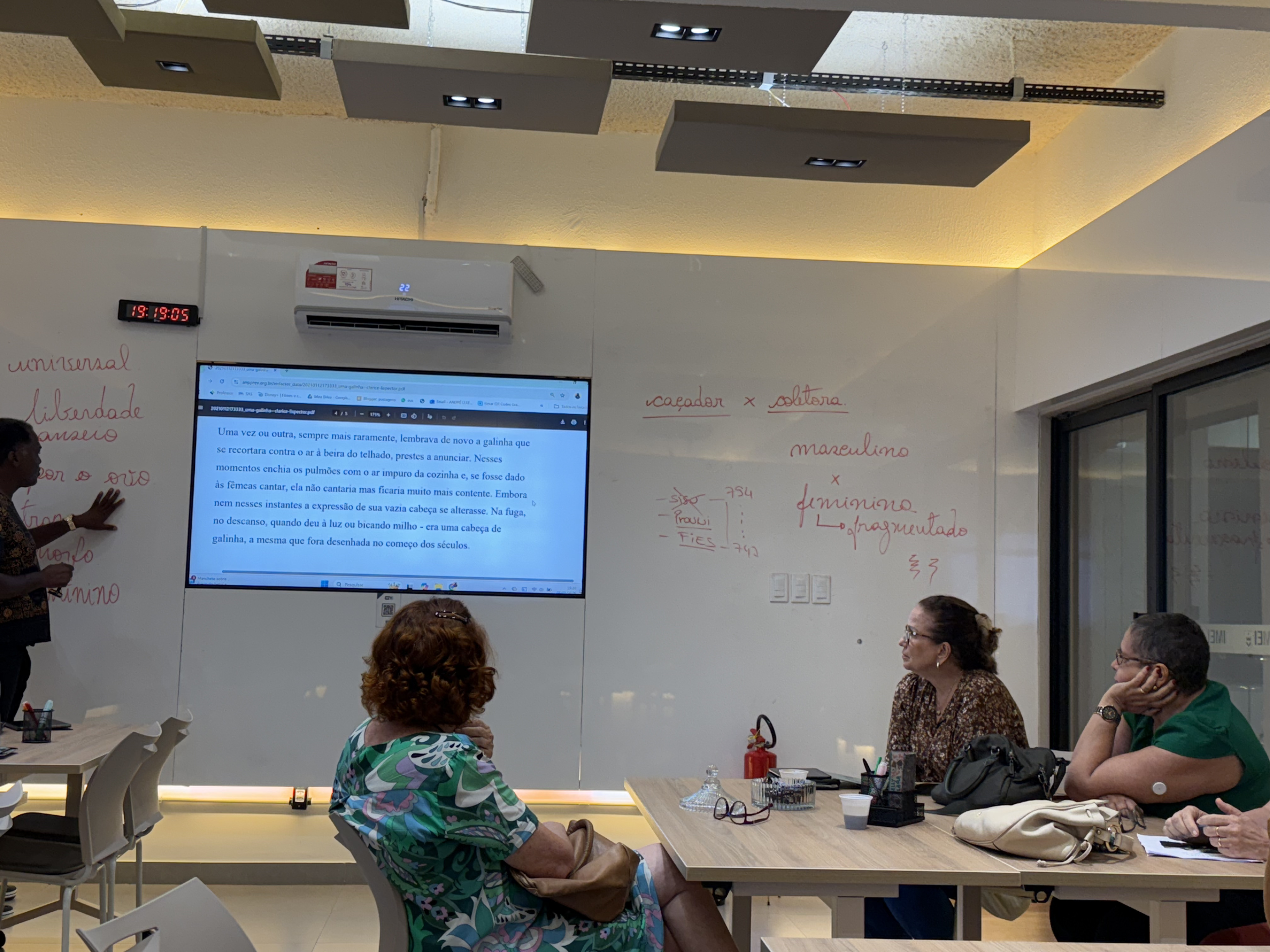 O professor André Luiz iniciou o encontro trazendo reflexões sobre a primeira leitura programada pelo projeto que foi “Uma Galinha”, de Clarice Lispector, o que deu início a reflexões profundas e conversas cheias de significados. A obra despertou diferentes interpretações, lembranças e sentimentos, permitindo que cada participante contribuísse com seu olhar único. A troca entre as participantes foi incrível, revelando vivências diversas e fortalecendo os laços construídos ao longo do encontro.
